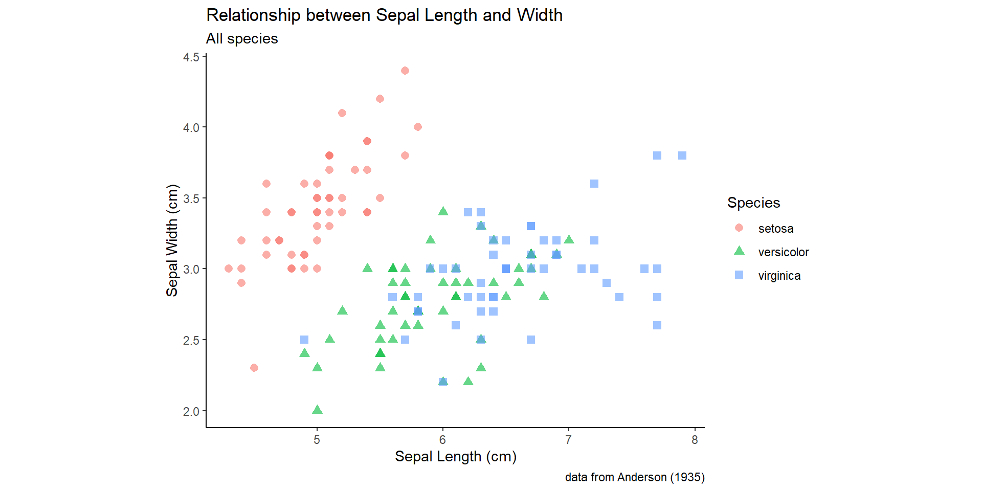 library(ggplot2) sepal.labels <-labs(x ="Sepal Length (cm)", y ="Sepal Width (cm)", title ="Relationship between Sepal Length and Width", caption ="data from Anderson (1935)") my.theme <-theme_classic() +theme(aspect.ratio =0.75) all.sepals <-ggplot(iris, aes(x = Sepal.Length, y = Sepal.Width)) all.sepals +geom_point(aes(color = Species, shape = Species), size =2.5, alpha =0.6) + sepal.labels +labs(subtitle ="All species") + my.theme