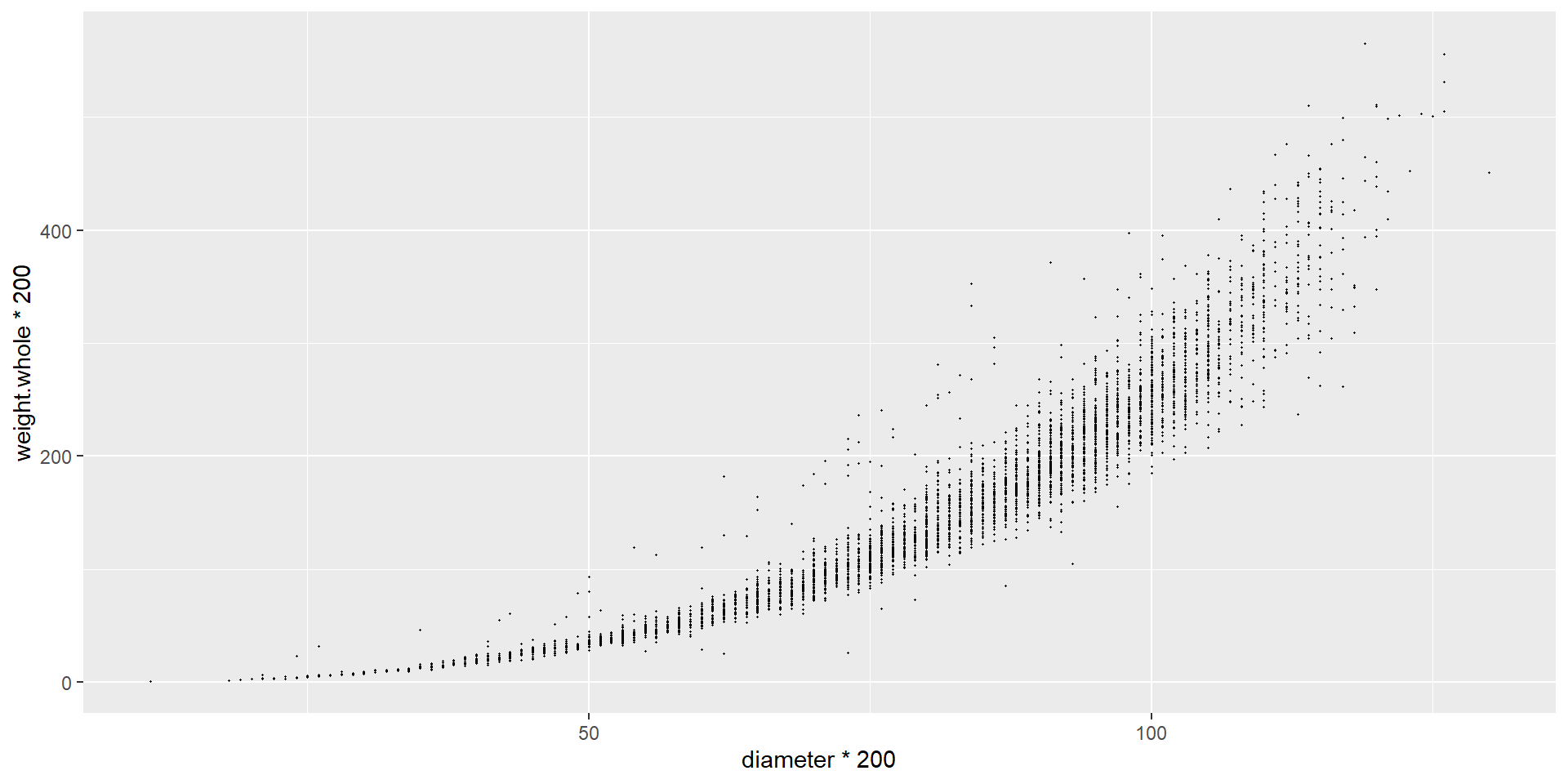 ggplot(data=abalone,aes(x=diameter*200,y=weight.whole*200)) +