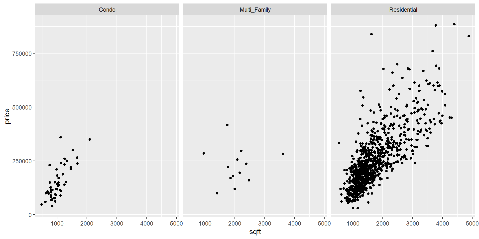ggplot(data=Sacramento,aes(x=sqft,y=price)) +