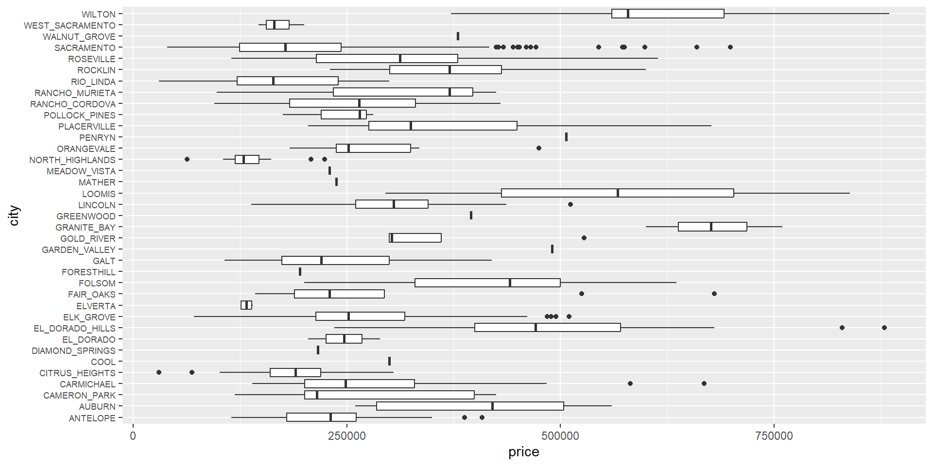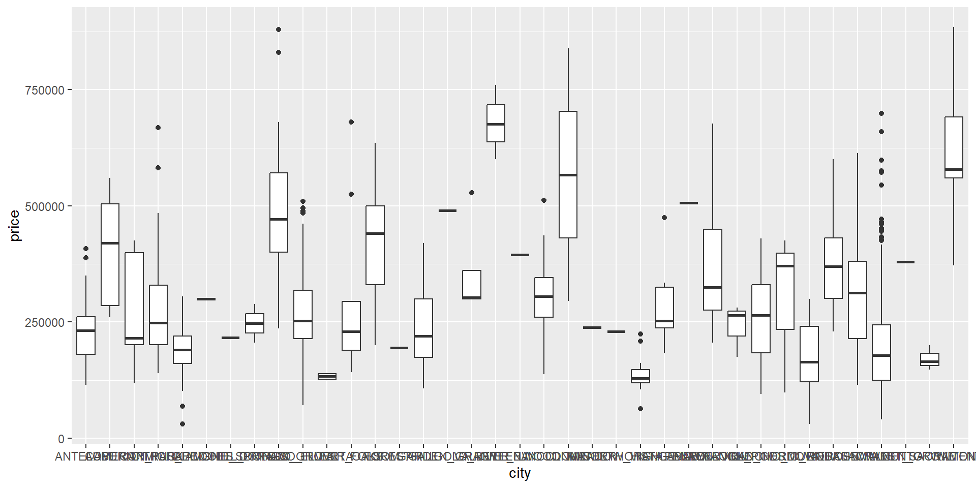 ggplot(data=Sacramento,aes(x=city,y=price)) +