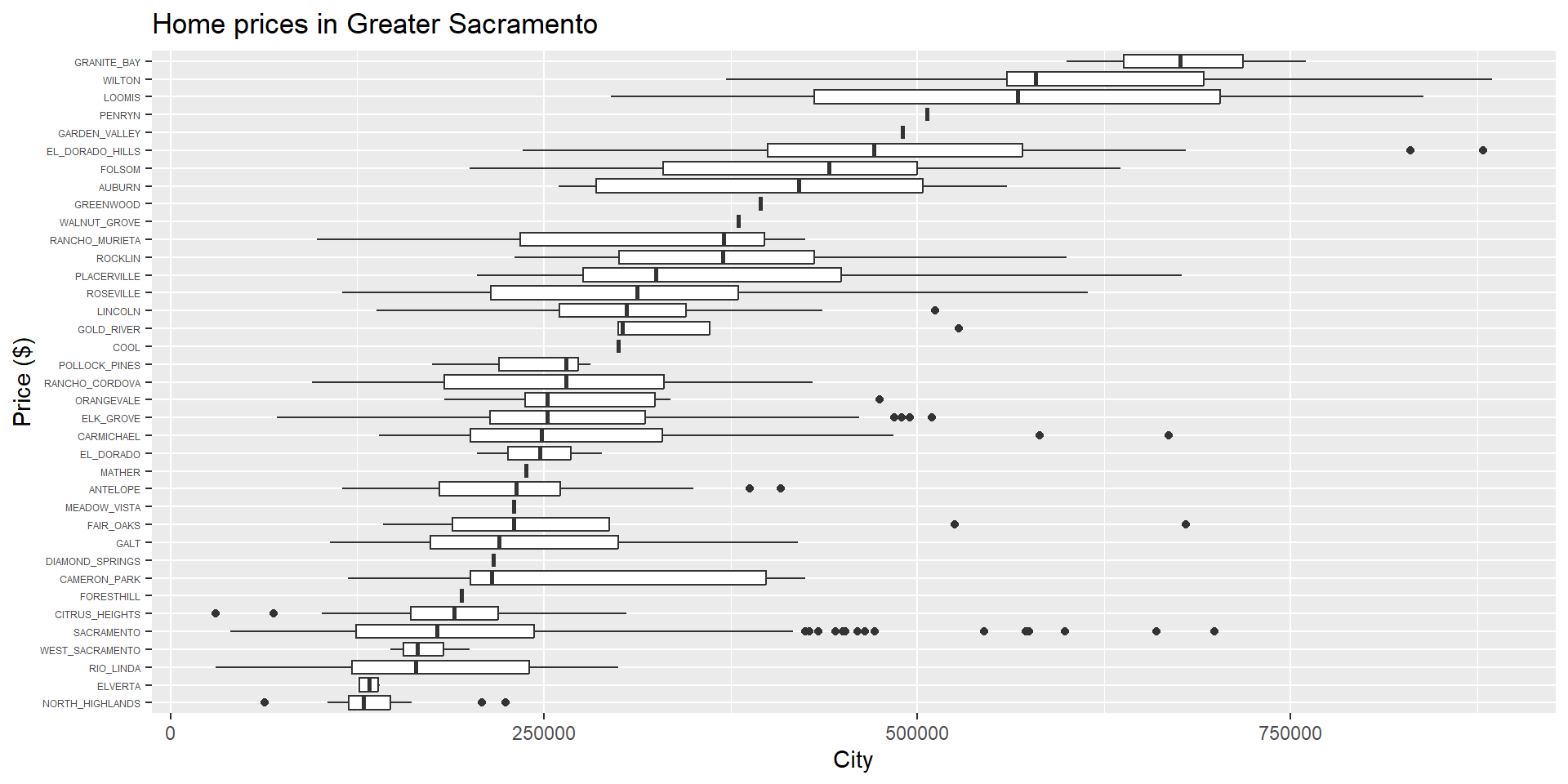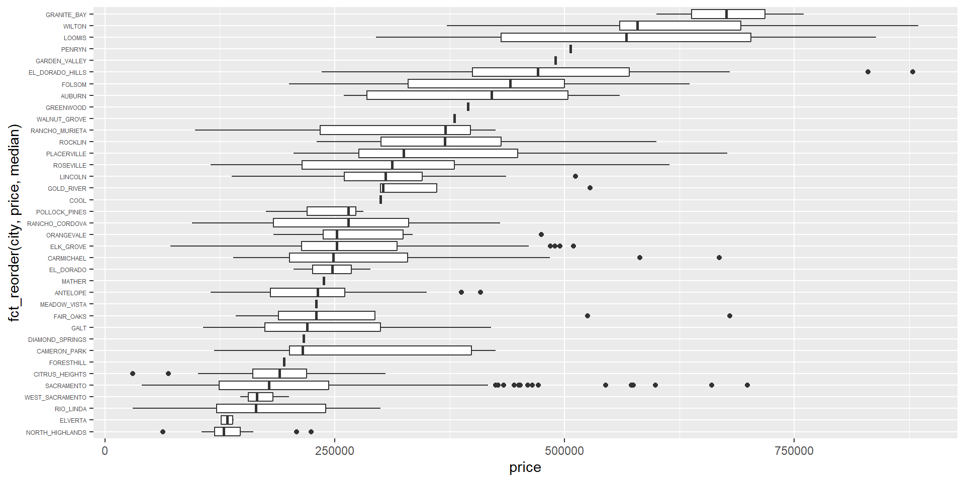 ggplot(data=Sacramento,aes(x=fct_reorder(city,price,median),y=price)) +