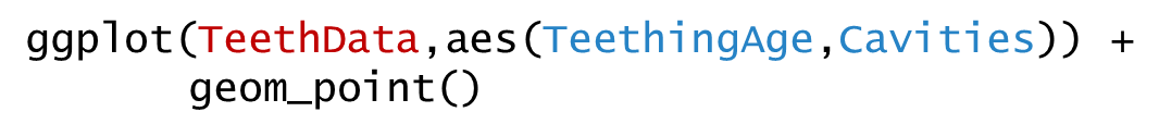 ggplot (aes (x= diameter_mm,y= rings)) + geom_point () + labs (x= "Diameter (mm)" ,y= "Rings" )