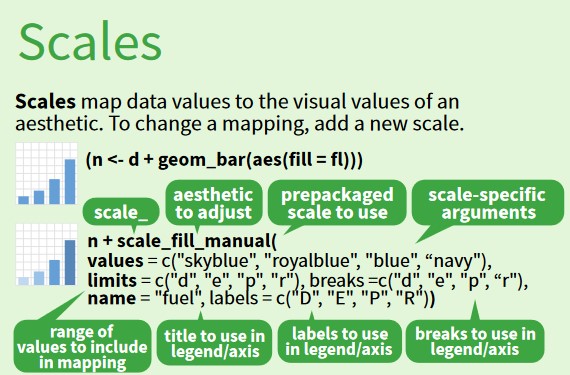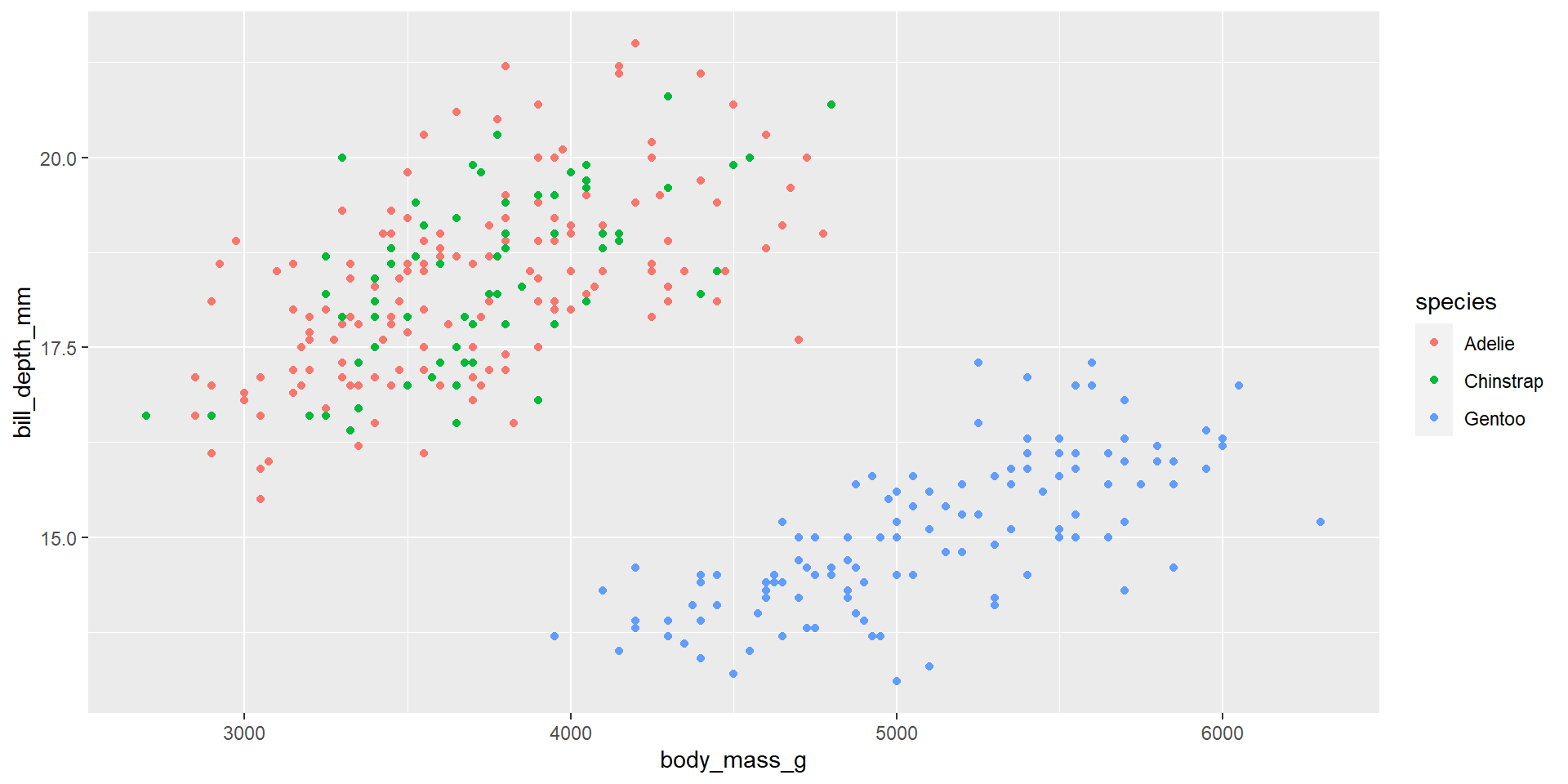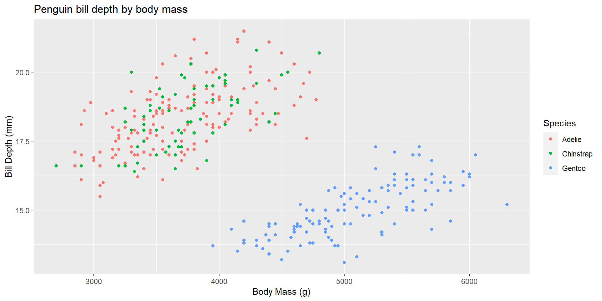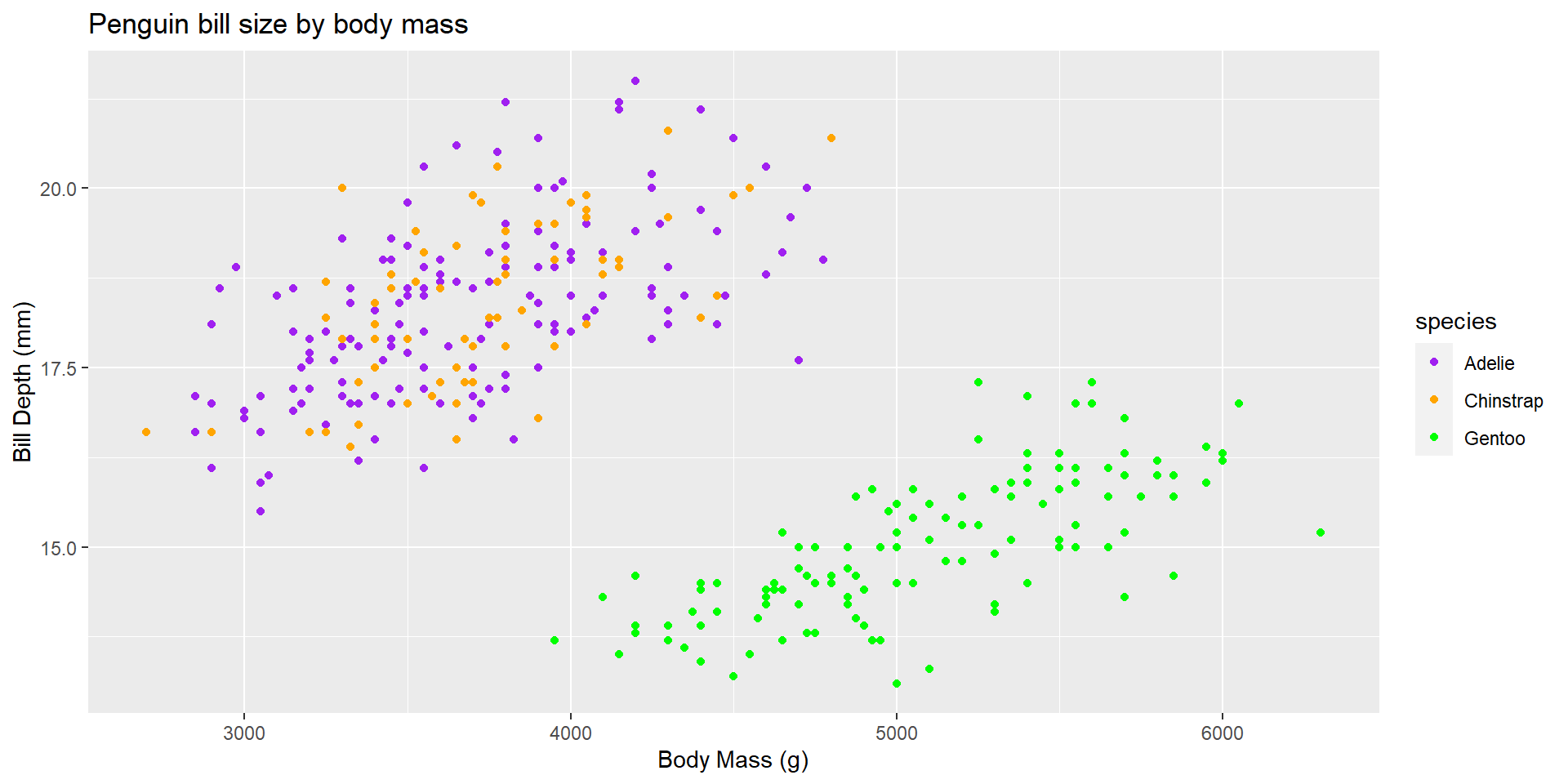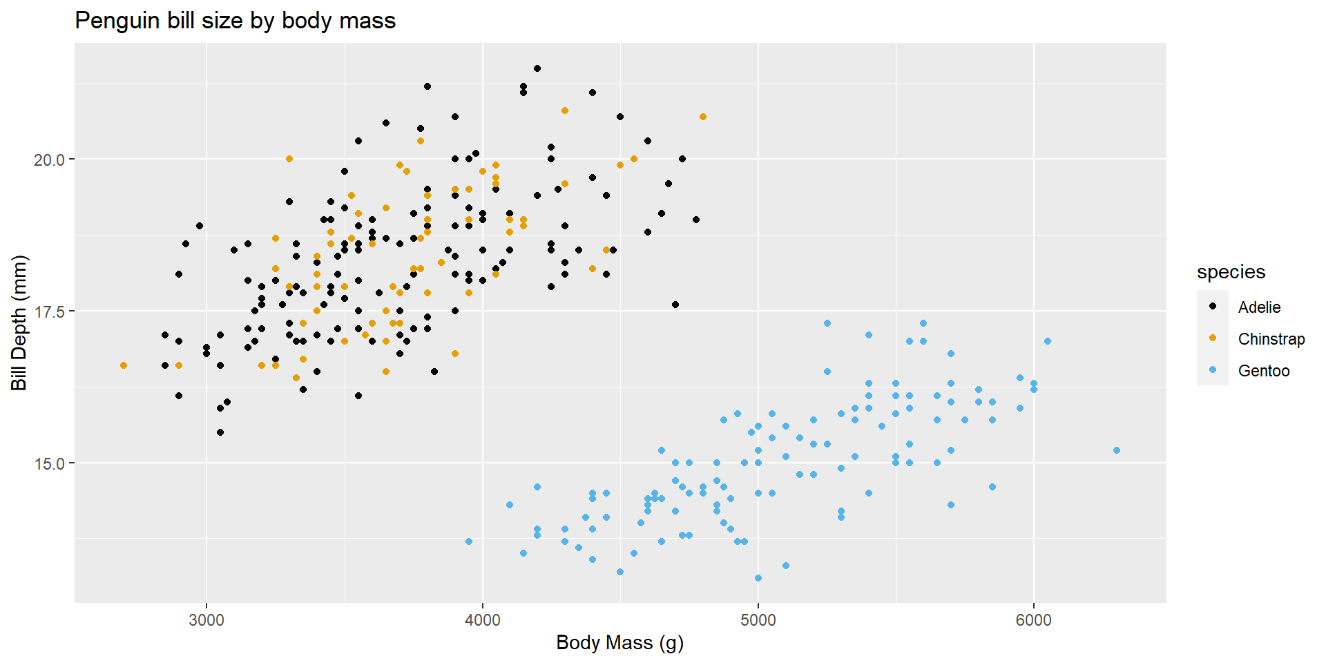 library(ggthemes)ggplot(penguins,aes(body_mass_g,bill_depth_mm,color=species))+geom_point() +labs(x="Body Mass (g)",y="Bill Depth (mm)",title="Penguin bill size by body mass") +scale_color_colorblind()