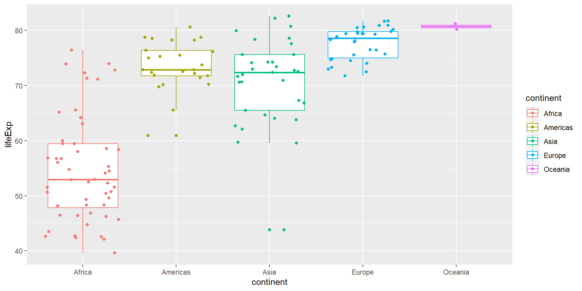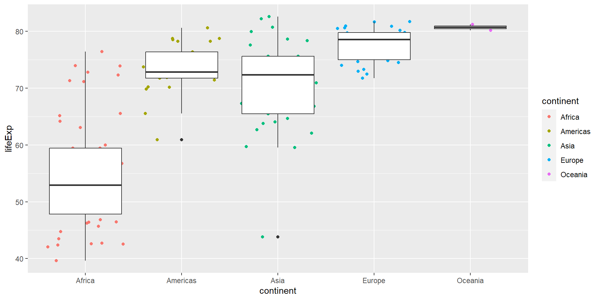 ggplot(data=gm2007,aes(x = continent, y = lifeExp)) +geom_jitter(aes(color = continent)) +geom_boxplot()