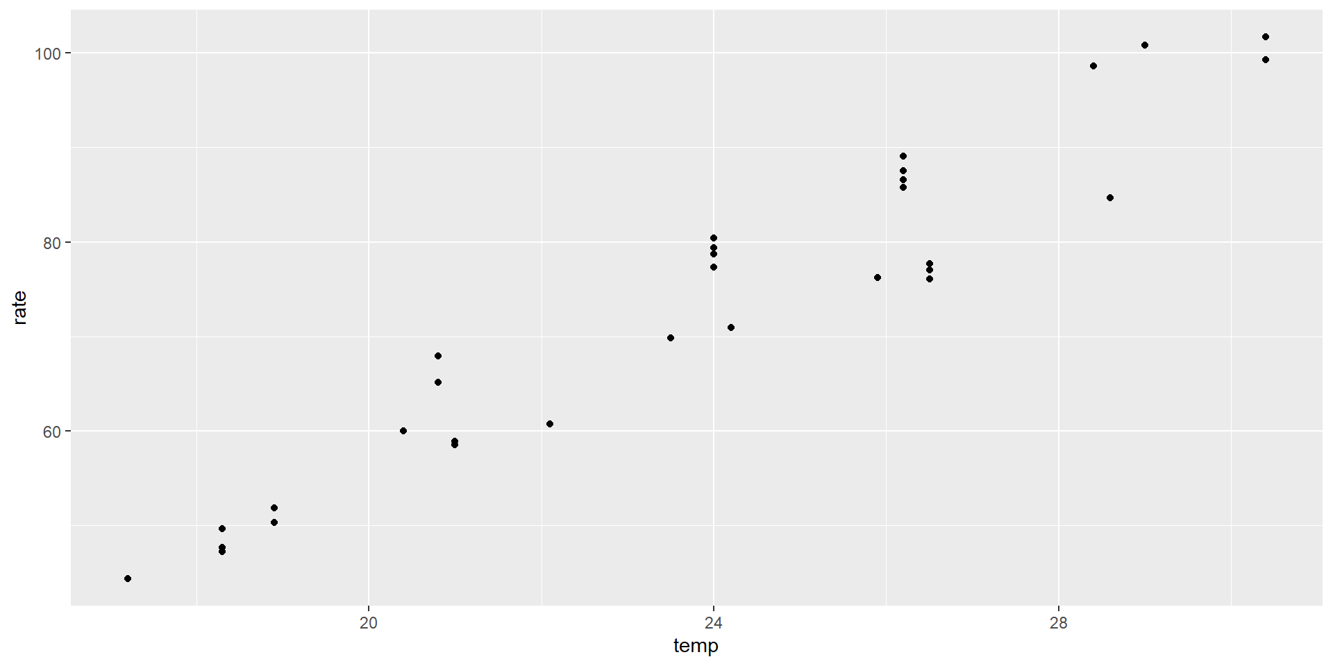 ggplot (data= crickets,aes (x= temp,y= rate)) +