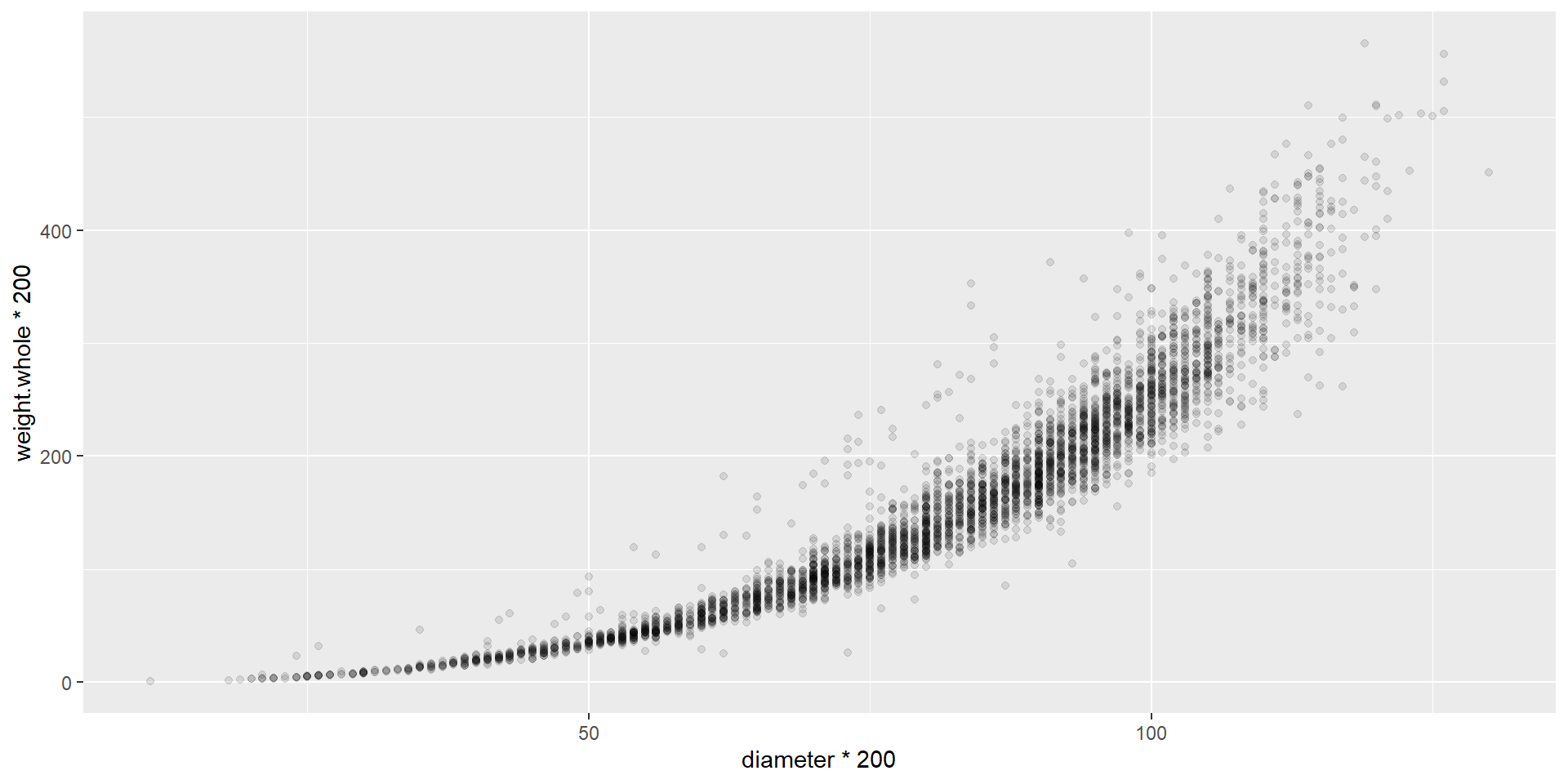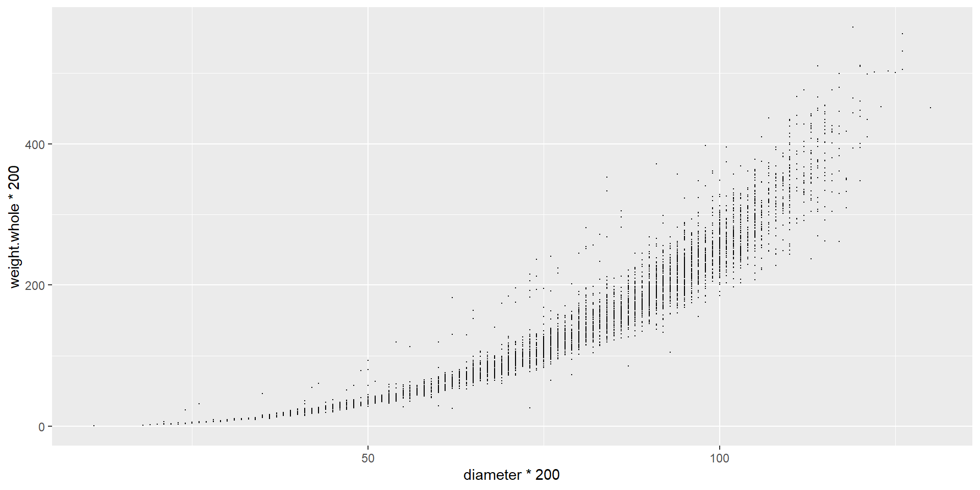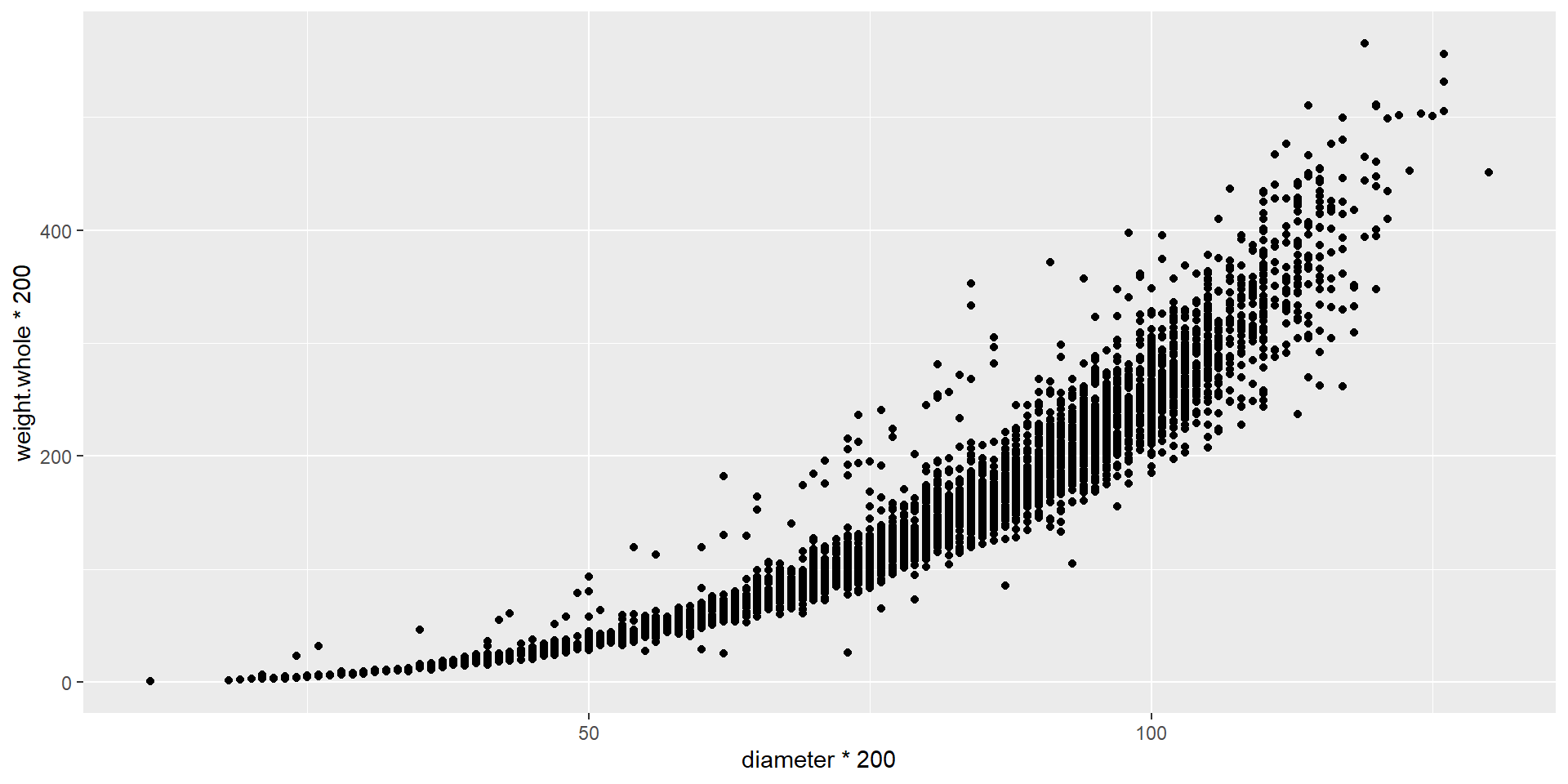 ggplot(data=abalone,aes(x=diameter*200,y=weight.whole*200)) +
