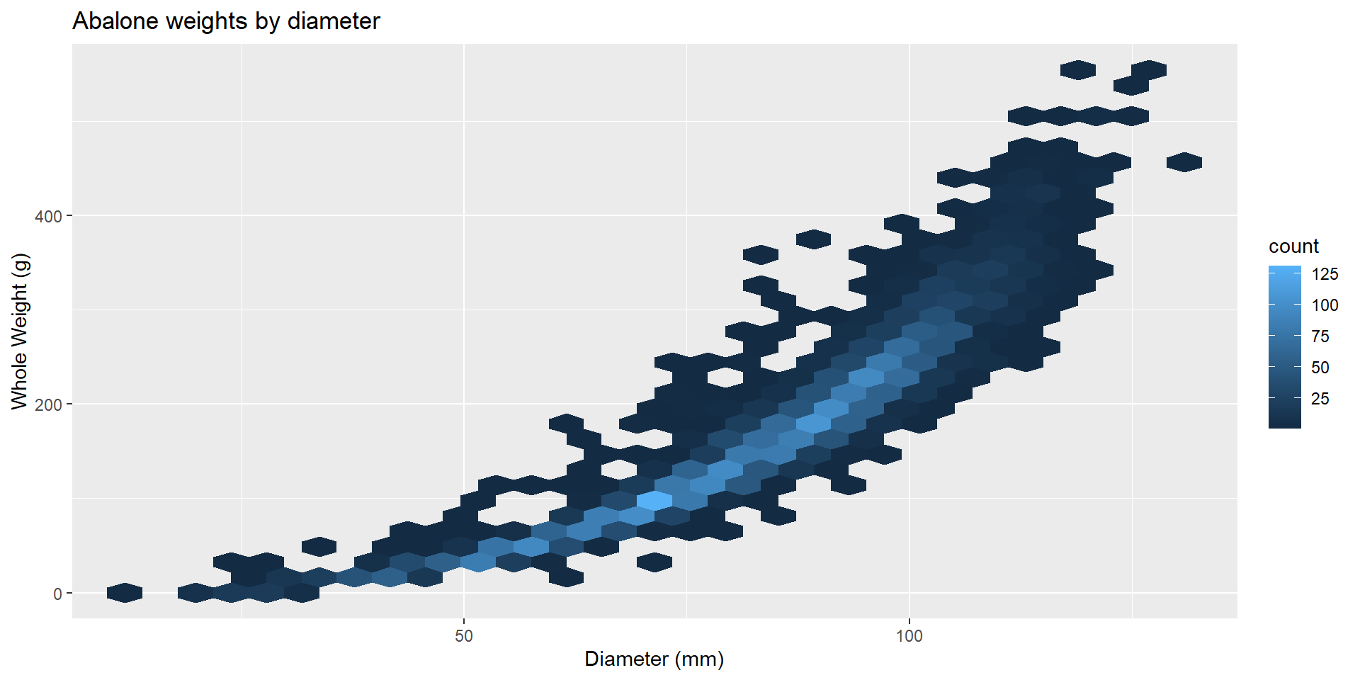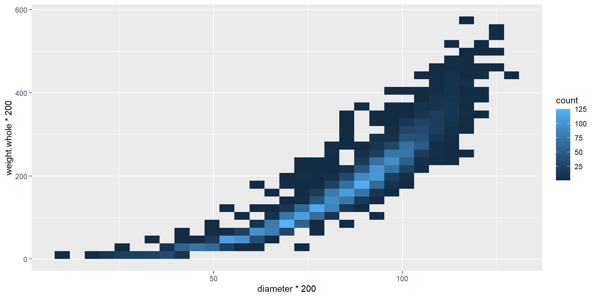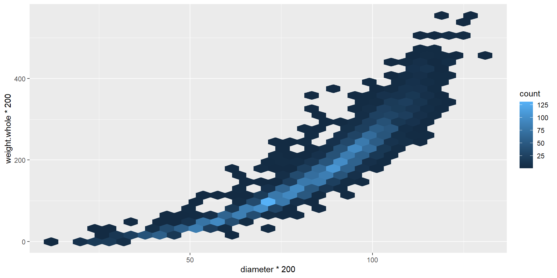 ggplot(data=abalone,aes(x=diameter*200,y=weight.whole*200)) +
