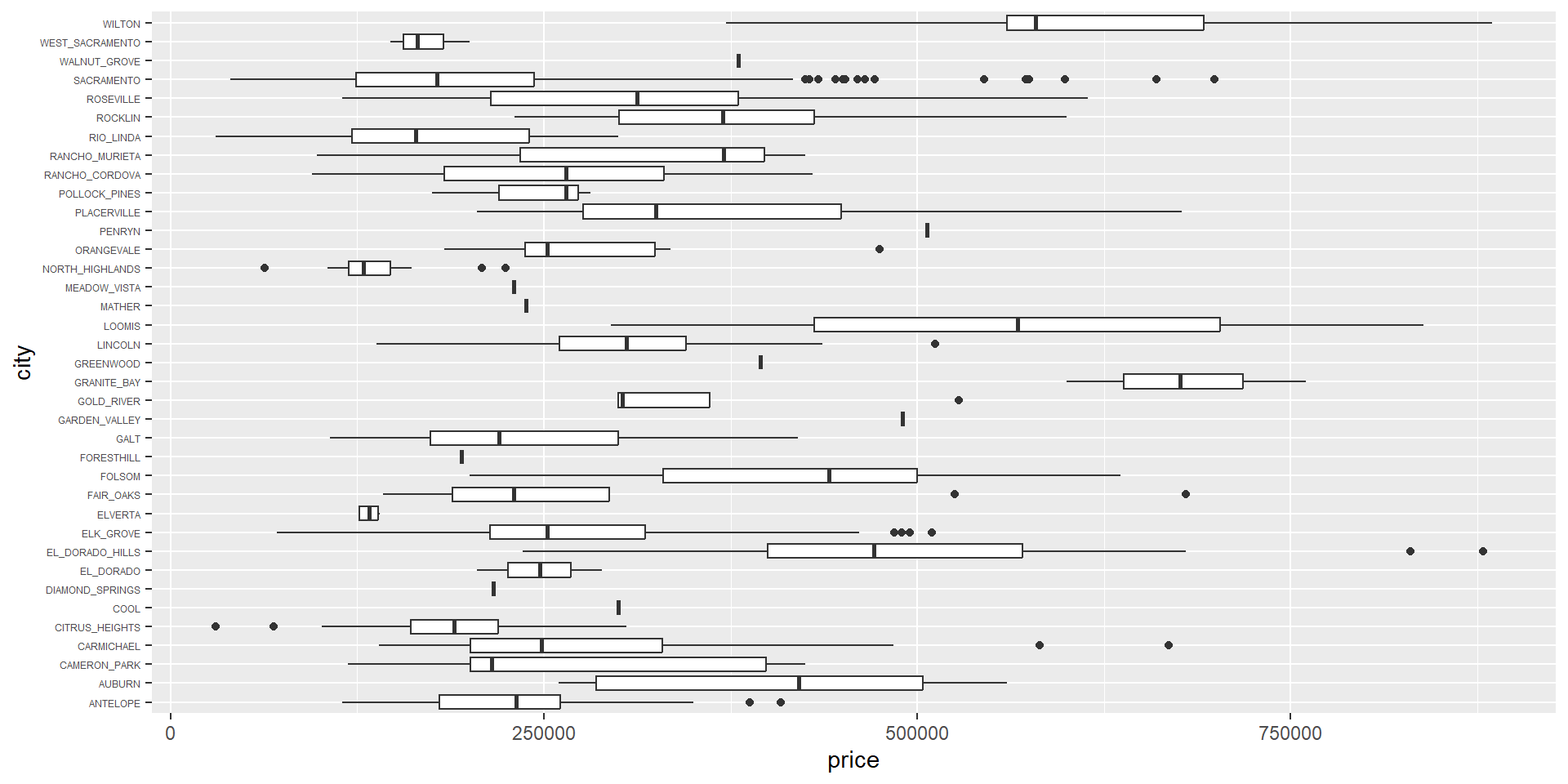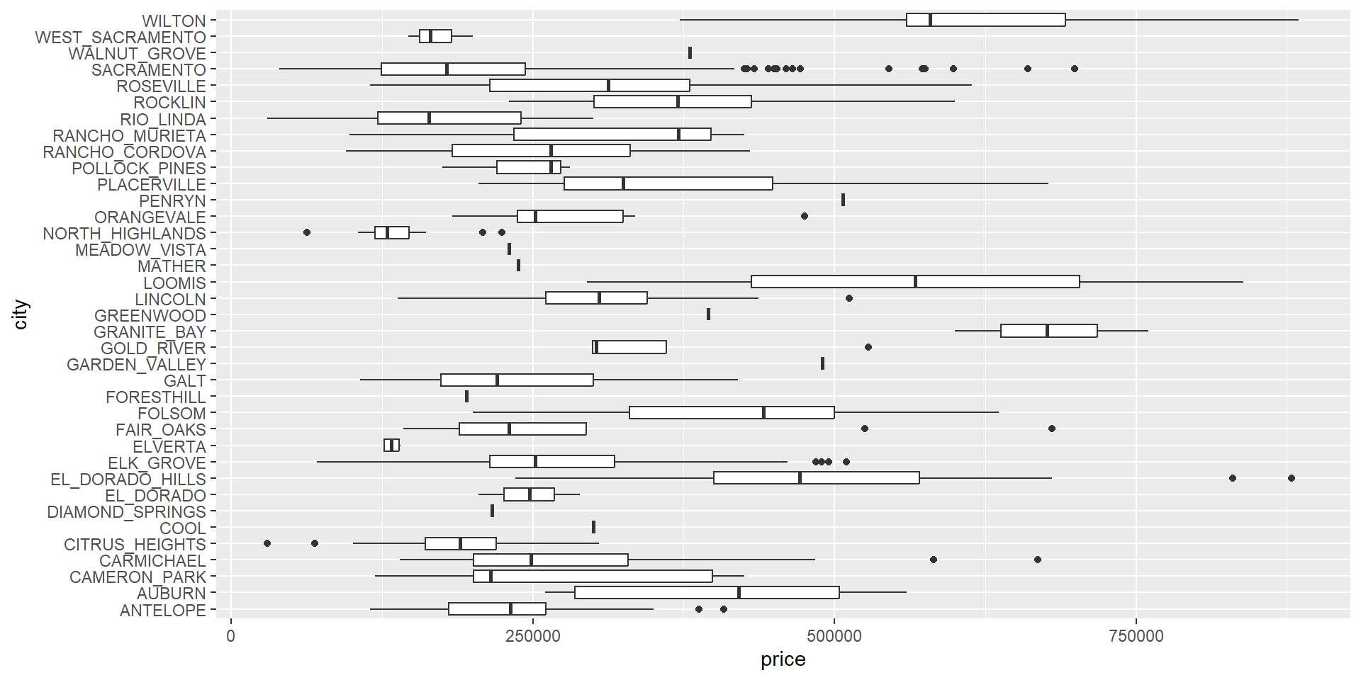ggplot(data=Sacramento,aes(x=city,y=price)) +